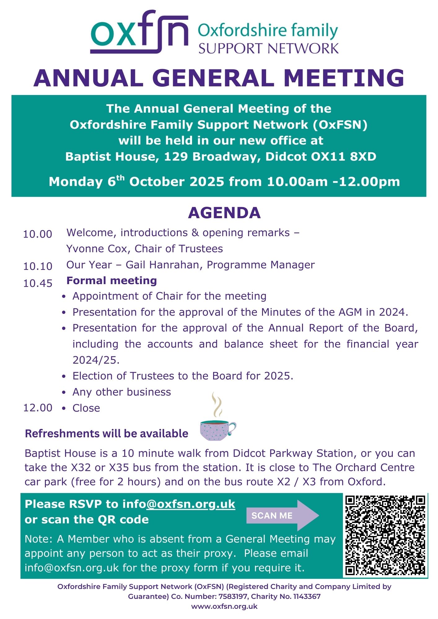 The OxFSN Annual General Meeting is being held from 10.00am - 12.00pm on 6th October at our new office at Baptist House, 129 Broadway, Didcot OX11 8XD.